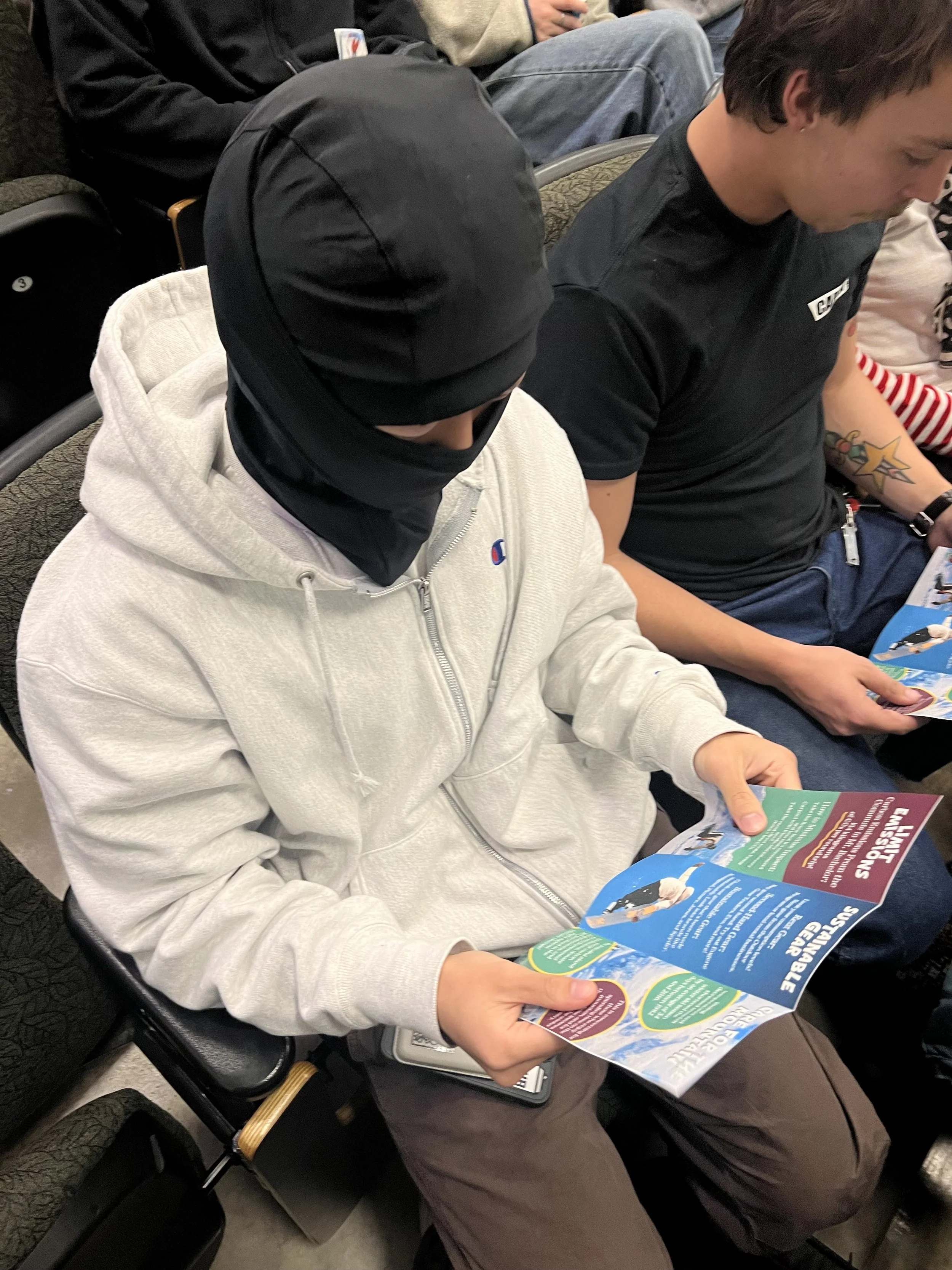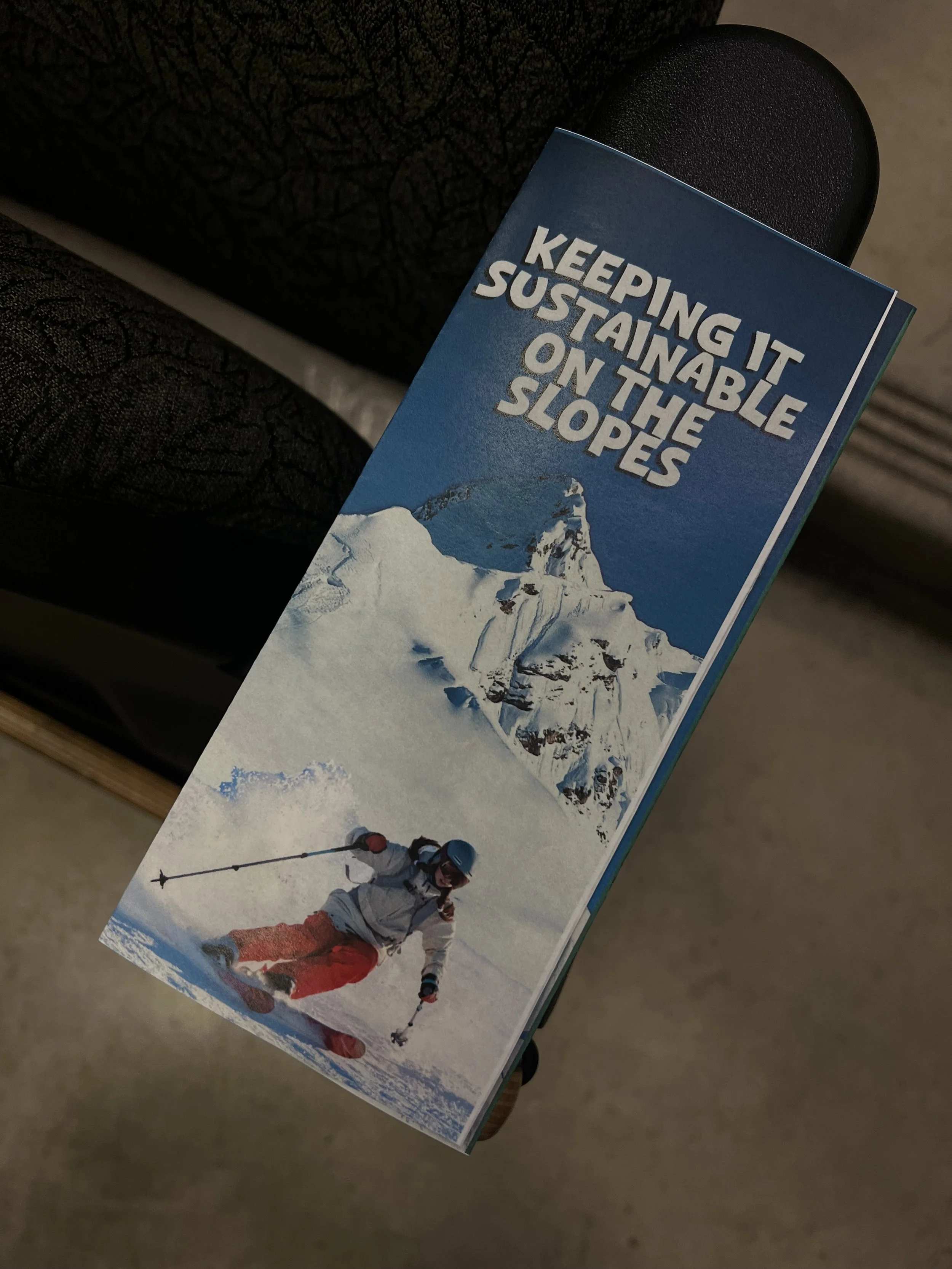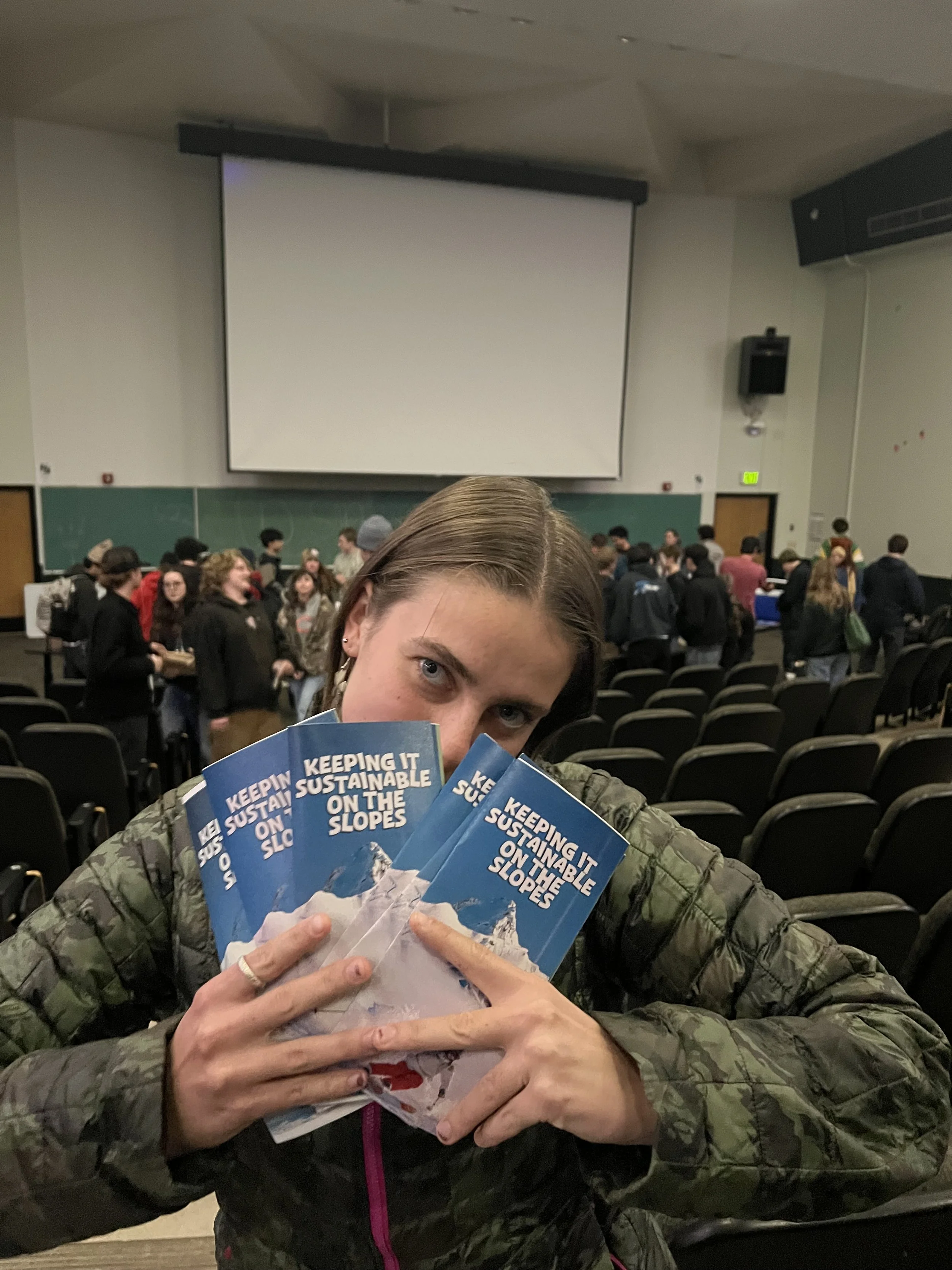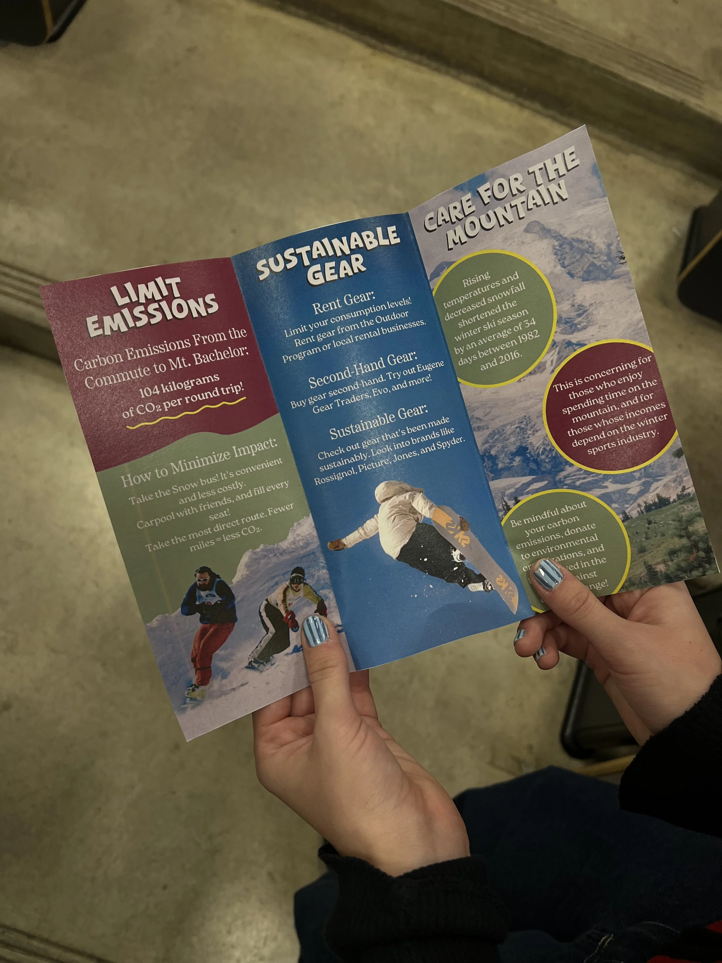 Our extreme sports group created a pamphlet including carbon emissions it takes to get to Mt. Bachelor, sustainable snow gear, and how to care for the mountain.